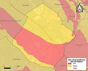 Le retrait-gonflement des sols argileux est susceptible d'engendrer des dommages importants aux bâtiments en cas d’alternance de périodes de sécheresse et de pluie. La totalité de la commune est en aléa moyen ou fort (67,4 % au niveau départemental et 48,5 % au niveau national). Sur les 644 bâtiments dénombrés sur la commune en 2019, 644 sont en aléa moyen ou fort, soit 100 %, à comparer aux 84 % au niveau départemental et 54 % au niveau national. Une cartographie de l'exposition du territoire national au retrait gonflement des sols argileux est disponible sur le site du BRGM[23],[Carte 2].