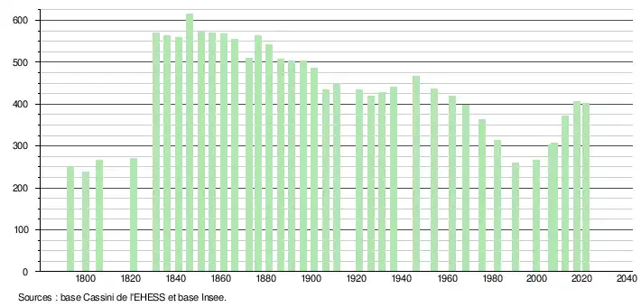 L'évolution du nombre d'habitants est connue à travers les recensements de la population effectués dans la commune depuis 1793. Pour les communes de moins de 10 000 habitants, une enquête de recensement portant sur toute la population est réalisée tous les cinq ans, les populations légales des années intermédiaires étant quant à elles estimées par interpolation ou extrapolation[34]. Pour la commune, le premier recensement exhaustif entrant dans le cadre du nouveau dispositif a été réalisé en 2007[35].