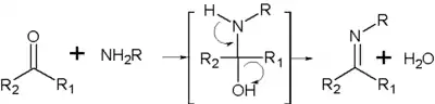 La méthode classique de formation d'une imine est de faire réagir un composé carbonylé (aldéhyde ou cétone) sur une amine primaire, en présence d'un acide, l'électrophilie de l'atome de carbone du groupe carbonyle est ainsi augmentée par protonation. La réaction est favorisée par l'élimination de l'eau du milieu au fur et à mesure de sa formation.
