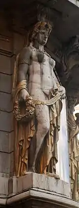Au bel étage, quatre cariatides d'Antoine Bouré et Hippolyte Le Roy, beaucoup plus réussies selon Pierre Loze que celles qui ornent la façade du Café Métropole de Gédéon Bordiau, soutiennent le balcon[1]. Prolongeant les pilastres du niveau inférieur, ces cariatides portent des ornements dorés consistant en couronnes, coupes, colliers, ceintures et tuniques au drapé élégant.