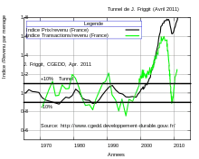 Depuis 1965, les prix de logements en France ont fait preuve d'une relative stabilité par rapport au revenu par ménage. Jacques Friggit, chargé de mission au Conseil général de l'environnement et du développement durable, a observé que les prix des logements étaient reliés à la croissance des revenus des ménages et qu'ils oscillaient avec une marge de 10 % autour d'une tendance longue (tunnel de Friggit). Les prix en France ont été confinés dans le tunnel pendant plus de 37 ans, jusqu'en 2002.