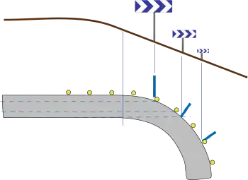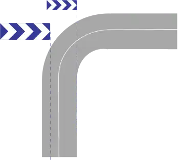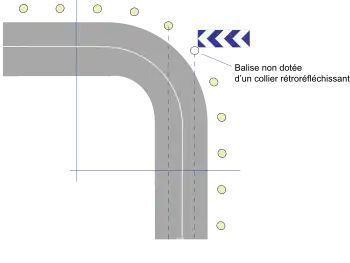 La balise unique (ou la première balise) est implantée dans l´axe de la voie droite pour les virages à gauche et dans l´axe de la voie gauche pour les virages à droite. La deuxième balise éventuelle est implantée dans les deux cas dans le prolongement du bord intérieur de la route.