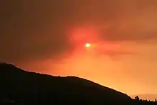 L'incendie criminel[31] de Santiago a démarré près des communautés de Santiago Canyon et de Silverado, dans le comté d'Orange, le [32] et a brûlé environ 115 km2. les flammes ont menacé environ 750 maisons parsemées dans les canyons de la région, dont Santiago, Silverado Canyon, Live Oak Canyon, Holy Jim Canyon, Modjeska Canyon, et Trabuco Canyon, entre autres. Il a été contenu le par le travail de 1 100 pompiers. Selon Mike Rohde de la Orange County Fire Authority, c'est parce que le vent est resté normal que les dégâts ont été limités[33].