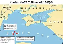 Le Commandement européen des États-Unis déclare dans un communiqué qu'un drone américain MQ-9 Reaper, provenant de la base aérienne de Câmpia Turzii en Roumanie[5], survolait les eaux internationales de la mer Noire, escorté par deux avions russes, lorsque l'un des avions a volé devant le drone et largué du carburant. Puis, l'un des avions a endommagé l'hélice du drone, le forçant à s'abîmer en mer Noire à mi-chemin entre la Bulgarie et la Crimée. L'incident se produit vers 7 h 3, heure locale.