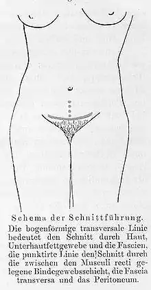 Le chirurgien coupe sur une ligne généralement horizontale (légèrement incurvée) juste au-dessus de la symphyse pubienne. La peau et la graisse sous-cutanée sont soulevées du fascia musculaire droit, en direction de la tête. Cela permet d'accéder à la ligne médiane inférieure du fascia de la paroi abdominale antérieure. Le fascia est coupé verticalement pour séparer les muscles droits et pénétrer dans l'abdomen.