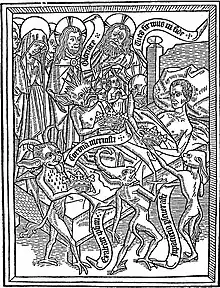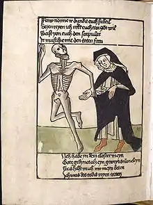 - Danse macabreReprésente des squelettes dansant devant leurs victimes de plusieurs classes sociales et professions. Ce sujet a été repris dans plusieurs incunables xylographiques, dont le plus célèbre est celui conservé à l'université de Heidelberg[37],[38],[39].