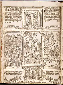 - Texte original : « interpreted events drawn from the Bible or other sources in medieval religious thought. The woodcut pictures in all were meaningful even to the illiterate and semi-literate, and they aided clerics and preaching monks to dramatise their sermons[3]. »