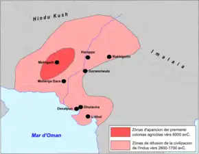 Extension de la civilisation de la vallée de l'Indus (en rose) à partir des zones d'apparition de l'agriculture dans la région (en rouge).