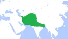 Extension de l'Empire Moghol durant le règne d'Akbar (vert foncé) et conquêtes durant le règne d'Aurangzeb (vert intermédiaire). En vert clair, l'état du Gondwana tributaire de l'Empire.