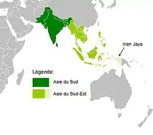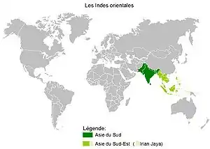 Le terme géographique d'Indes, ou Indes orientales, est utilisé à l'époque coloniale par les Européens pour désigner les territoires d'Asie du Sud et du Sud-Est, c'est-à-dire les actuels Béloutchistan iranien, Pakistan, Inde, Népal, Bhoutan, Bangladesh, Birmanie, Sri Lanka, Maldives, Thaïlande, Malaisie, Viêt Nam, Cambodge, Laos, Philippines, Brunéi, Singapour, Timor oriental et Indonésie (appelée Indes orientales néerlandaises avant l'indépendance), à l'exception de la Nouvelle-Guinée occidentale, qui fait partie de la Mélanésie.