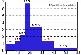 | Salaires | entre 0 (inclus) et 8 exclus | entre 8 (inclus) et 12 exclus | entre 12 (inclus) et 16 exclus | entre 16 (inclus) et 20 exclus | entre 20 (inclus) et 30 exclus | entre 30 (inclus) et 40 exclus | entre 40 (inclus) et 60 exclus | Total |