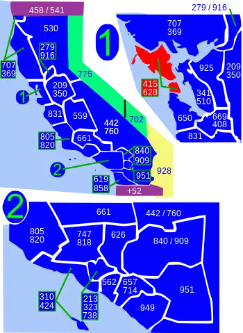 Carte de l'État de Californie avec les territoires de ses indicatifs régionaux. L'indicatif régional 415 est en rouge.