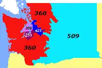 Carte de l'État de Washington avec les territoires de ses indicatifs régionaux. L'indicatif régional 509 est en turquoise.