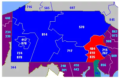 Carte de l'État de Pennsylvanie (en bleu et rouge) avec les territoires de ses indicatifs régionaux. Le territoire des indicatifs régionaux 610 et 484 est en rouge.