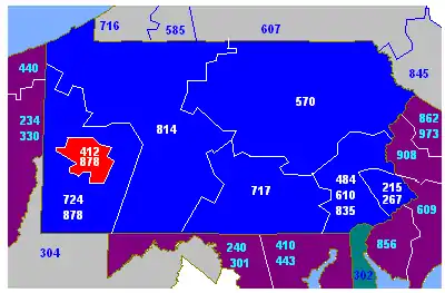 Carte de l'État de Pennsylvanie (en bleu et rouge) avec les territoires de ses indicatifs régionaux. Le territoire de l'indicatif régional 724 se trouve au sud-ouest de l'État.