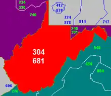 Les indicatifs régionaux 304 et 681 font partie du Plan de numérotation nord-américain.