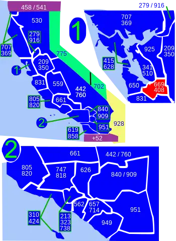 Carte de l'État de Californie avec les territoires de ses indicatifs régionaux. L'indicatif régional 408 est en rouge.