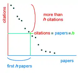 Autrement dit, un chercheur avec un indice de h a publié h articles qui ont été cités au moins h fois[4]. Dès lors, l'indice h reflète à la fois le nombre de publications et le nombre de citations par publication. L'indice permet d'aller plus loin que la simple mesure du nombre d'articles ou de citations, tout en ne permettant qu'une comparaison des chercheurs à l'intérieur d'un même champ (les conventions de citation pouvant varier). En physique, un chercheur de niveau moyen devrait avoir un à peu près équivalent à la durée de sa carrière, tandis que pour les chercheurs en sciences biologiques et biomédicales cette valeur est généralement plus élevée.