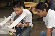Deux modélistes dans une salle du Centre spatial de la NASA pour les Olympiades de sciences.