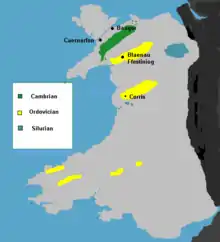 Les gisements d'ardoise au pays de Galles se sont formés au cours des trois premières périodes de l'ère géologique du Paléozoïque : le Cambrien, l'Ordovicien et le Silurien. Les gisements de la période du Cambrien s'étendent, dans le nord-ouest du pays de Galles, de la ville maritime de Conwy jusqu'aux environs de Criccieth; ces gisements furent exploités dans les carrières de Penrhyn, de Dinorwig et dans la vallée de Nantlle. On trouve par ailleurs des gisements de cette période de moindre importance dans la région d'Anglesey, à l'extrême nord du pays de Galles. Les gisements de la période géologique de l'Ordovicien, situés également dans le Sud-Ouest, s'étendent de la ville de Betws-y-Coed à la ville côtière de Porthmadog; ceux-ci furent surtout exploités autour de Blaenau Ffestiniog. On trouve d'autres bancs d'ardoise datant de cette ère géologique plus au Sud, de Llangynog au village de Aberdyfi, exploités principalement dans les environs de Aberdyfi ; on trouve aussi quelques affleurements du côté de Pembrokeshire. Les gisements de la période du Silurien, quant à eux, se situent plus à l'est, dans la vallée de Dee et aux abords de Machynlleth[3].