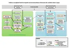 Schéma conceptuel liant les impacts environnementaux et humains du nucléaire dans 4 pays