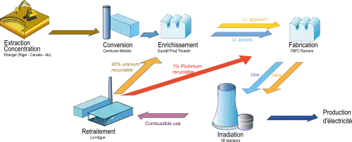 - Orano, avec ses filiales Orano Cycle et Orano Mining est présent dans les étapes du cycle du combustible nucléaire de l'extraction au raffinage, ainsi qu'au recyclage. Orano extrait l'uranium au Niger, au Canada et au Kazakhstan ;
