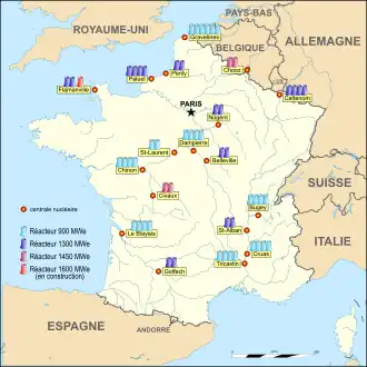 La France décide de réduire la part du nucléaire dans la production d’électricité à 50 % à l’horizon 2025, lors de l'adoption de la loi relative à la transition énergétique pour la croissance verte de 2015[1]. Le gouvernement acte, en , du report au-delà de 2025 de la baisse de la part du nucléaire de 75 à 50 % de la production d'électricité, dont le calendrier est fixé en 2019 par la programmation pluriannuelle de l'énergie, qui reporte à 2035 l'objectif de 50 %. En 2020, la centrale nucléaire de Fessenheim, première centrale REP de la filière à 900 MW de France, est mise définitivement à l'arrêt.