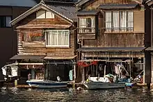 Ine no Funaya (伊根の舟屋) sont des maisons de pêcheurs en bois qui bordent la côte de la baie d'Ine sur environ 5 kilomètres. Le terme japonais Funaya signifie maison-bateau : chaque maison se compose d'un hangar à bateau sur pilotis surmonté d'un étage servant au stockage ou à la préparation des filets. Leur nombre est estimé à 230[4].