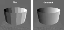 - Illumination face par face : La normale de la face est calculée en fonction de la position de ses sommets dans l'espace. À partir de cette normale, et des propriétés de la surface, on additionne la lumière ambiante, ainsi que la réflexion (diffuse et spéculaire) des lumières projetées par les sources lumineuses. Cela permet d'avoir un rendu relativement réaliste avec peu de calcul. Il est possible d'augmenter à certains endroits les faces pour un rendu plus précis.