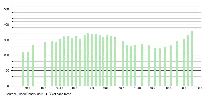 L'évolution du nombre d'habitants est connue à travers les recensements de la population effectués dans la commune depuis 1793. À partir du , les populations légales des communes sont publiées annuellement dans le cadre d'un recensement qui repose désormais sur une collecte d'information annuelle, concernant successivement tous les territoires communaux au cours d'une période de cinq ans. Pour les communes de moins de 10 000 habitants, une enquête de recensement portant sur toute la population est réalisée tous les cinq ans, les populations légales des années intermédiaires étant quant à elles estimées par interpolation ou extrapolation[6]. Pour la commune, le premier recensement exhaustif entrant dans le cadre du nouveau dispositif a été réalisé en 2004[7],[Note 1].