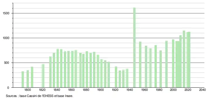L'évolution du nombre d'habitants est connue à travers les recensements de la population effectués dans la commune depuis 1793. Pour les communes de moins de 10 000 habitants, une enquête de recensement portant sur toute la population est réalisée tous les cinq ans, les populations légales des années intermédiaires étant quant à elles estimées par interpolation ou extrapolation[17]. Pour la commune, le premier recensement exhaustif entrant dans le cadre du nouveau dispositif a été réalisé en 2004[18].