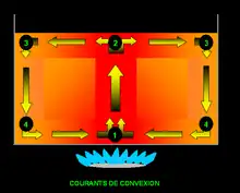 Le chauffage par convection naturelle : l'air frais provient du niveau du sol, là où il est le plus froid, se réchauffe dans la double paroi (dessous et derrière le foyer) et commence son ascension pour sortir par les grilles d'air chaud[7].