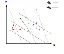 Dans certaines conditions stables hydrostatiques et inertielles, un déplacement latéral oblique peut cependant être instable lorsque la particule change de masse d'air ou de régime de vent. La figure de droite montre une telle situation. Le déplacement de la particule d'air se fait par rapport aux lignes de moment cinétique () qui augmentent de gauche à droite et de température potentielle équivalente () qui augmentent avec la hauteur.