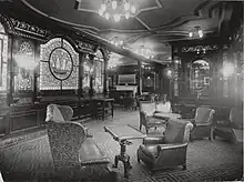 La salle est tapissée de carreaux de linoléum bleu profond sur lesquels se détache un motif élaboré rouge et jaune éclatants, et décorée de boiseries blanches. Ses hublots sont masqués par des vitraux, de façon à recréer l'intérieur d'une maison plus que d'un navire. La nuit, elles sont éclairées par derrière pour illuminer la pièce, qui dispose également de nombreuses lampes. La chaleur qu'elles dégagent est telle que des ventilateurs électriques sont répartis dans la pièce pour le confort des passagers[a 22]. Les menus, très copieux, sont préparés dans une cuisine adjacente, qui sert également à préparer les repas des passagers de deuxième classe[a 23].