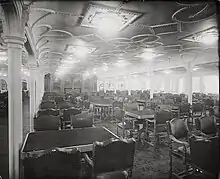 La salle à manger est accessible de 13 h à 14 h 30 et de 18 h à 19 h 30. Les passagers sont appelés pour le dîner par le steward de clairon (en l'occurrence Peter W. Fletcher) qui joue The Roast Beef of Old England[20]. Le dimanche, cette salle est également consacrée à l'office religieux anglican pour les passagers de première classe. Celui-ci est donné par le commandant ou, le cas échéant, par un pasteur voyageant en première classe. Le quintette du navire accompagne la cérémonie et dispose d'un piano[a 24]. En revanche, contrairement à ce qui est souvent représenté dans les films, l'orchestre ne joue pas durant les repas[a 25].