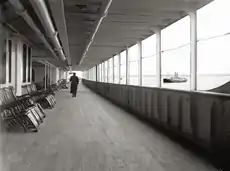 Sur le pont des embarcations, chaque extrémité de la promenade des premières classes est fermée par une barrière délimitant, à l'arrière, la promenade des mécaniciens, et à l'avant, celle des officiers. Le commandant peut cependant fournir à certains passagers qui le demandent l'autorisation de visiter la passerelle accompagnés par un officier[a 49].