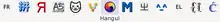 - Hangul — Hangeul coréen. Permet d'utiliser la disposition standard coréenne ou une disposition phonétique en fonction du clavier ;