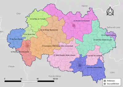 Depuis 2005, toutes les communes du département font partie d'un établissement public de coopération intercommunale (EPCI) à fiscalité propre[14]. Trois d'entre elles (Chassenard, Coulanges et Molinet) font partie d'une communauté de communes dont le siège se situe en Saône-et-Loire, la CC Digoin Val de Loire. Enfin, deux communes des départements limitrophes du Cher (Saint-Vitte) et du Puy-de-Dôme (Virlet) dépendent d'une intercommunalité dont le siège se situe dans l'Allier[14].