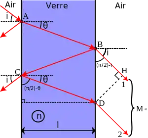 Les rayons lumineux sortant par la deuxième surface aux points B et D n'ont pas parcouru la même longueur de trajet (ou chemin optique). Ainsi, ils présentent un déphasage l'un par rapport à l'autre, dépendant de l'angle . Ces deux rayons interfèrent entre eux ainsi qu'avec tous les autres rayons qui auront été réfléchis plusieurs fois entre les deux surfaces réfléchissantes. On peut alors montrer que, selon la valeur de , le rayon est transmis ou pas.