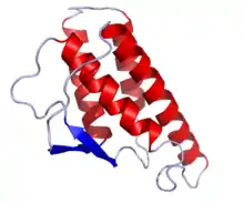 l'IL-4 est repliée de façon compacte et globulaire, comme beaucoup d'autres cytokines. Sa structure est stabilisée par trois ponts disulfures[2]. Un ensemble de quatre hélices alpha orientées vers la gauche constitue la moitié de la protéine[3]. Les hélices sont anti-parallèles et accolées à un feuillet béta formé de deux brins anti-parallèles[3].
