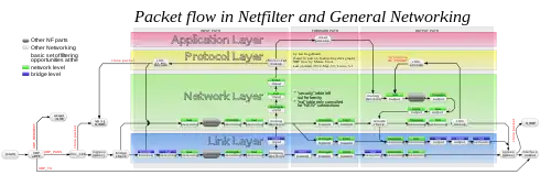 Différents programmes sont utilisés selon le protocole employé : iptables est utilisé pour le protocole IPv4, Ip6tables pour IPv6, Arptables pour ARP (Address Resolution Protocol) ou encore Ebtables, spécifique aux trames Ethernet.