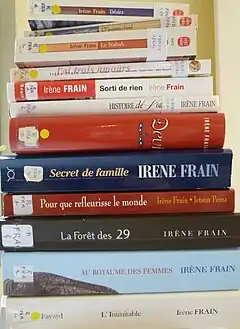 Irène Frain a relaté une partie de son enfance bretonne dans La Côte d’amour (2001) avec des photos de Christian Renaut et dans La Maison de la source en 2000. Dans Un crime sans importance (2020), elle aborde le meurtre de sa sœur aînée Denise assassinée le 8 septembre 2018 dans son pavillon de banlieue dans l'Essonne, un ouvrage qui reçoit le prix Interallié en 2020[10],[11],[12],[13].