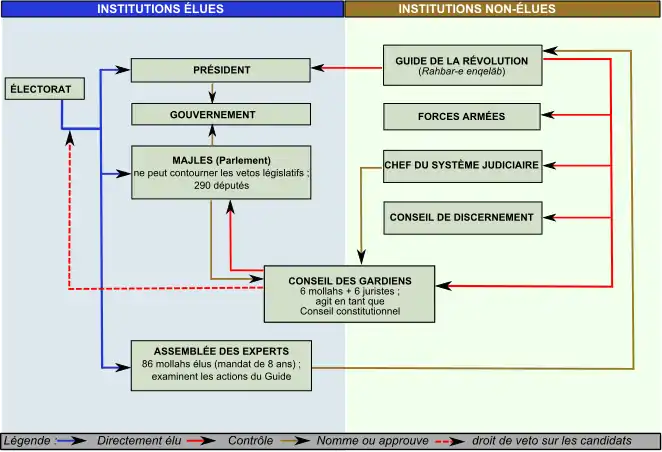 La république islamique est un régime autoritaire théocratique où le clergé chiite exerce le pouvoir, qui incorpore des éléments démocratiques dont l'élection au suffrage universel du président et des députés au Madjles. Le Guide de la révolution, Ali Khamenei depuis 1989, détient l'autorité suprême. La politique étrangère de l'Iran se caractérise par son opposition à Israël et aux États-Unis, et son soutien à certaines forces du monde arabe, le plus souvent chiites — milices irakiennes, gouvernement syrien, Hezbollah libanais.