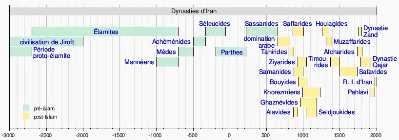 L’Iran ou la Perse est l’une des civilisations continues les plus anciennes du monde. L’histoire de l'Iran couvre des milliers d’années, depuis les civilisations antiques du plateau iranien, la civilisation des Mannéens en Azerbaïdjan, de Shahr-e Sokhteh (« Ville brûlée ») dans la province du Sistan-et-Baloutchistan, et l’ancienne civilisation de Jiroft, suivie du royaume d’Élam, de l’empire Achéménide, des Parthes, des Sassanides jusqu’à l’actuelle République islamique. Cette histoire est marquée par des alternances de périodes de domination étrangère et de périodes d'essor du pouvoir étatique iranien, elles-mêmes segmentées par des changements constitutionnels majeurs.