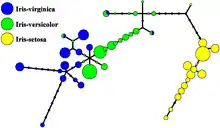 Néanmoins, les trois espèces d'iris sont séparables dans une projection avec une analyse en composantes principales non linéaire[6]. Le jeu de données est approximé par l'arbre le plus proche sous certaines contraintes. On a alors construit ce que l'on appelle une metro map[4]. Les données sont projetées sur le nœud le plus proche. À chaque nœud, la répartition des points projetés est représentée par un diagramme circulaire où la surface du cercle est proportionnelle au nombre de points projetés. Il ressort du diagramme que la majorité absolue des échantillons des différentes espèces d'iris appartient à des nœuds différents. Seule une petite partie des Iris virginica est mélangée avec les Iris versicolor (les nœuds à la fois bleus et verts sur le diagramme). Par conséquent, les trois espèces d'iris (Iris setosa, Iris virginica et Iris versicolor) sont séparables grâce à une analyse en composantes principales non linéaire. Pour les distinguer, il suffit simplement de sélectionner les nœuds correspondant sur l'arbre principal.