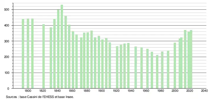 - Population municipale légale en vigueur au 1er janvier 2024, millésimée 2021, définie dans les limites territoriales en vigueur au 1er janvier 2023, date de référence statistique : 1er janvier 2021.