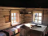 Au-dessus de l'entrée, entre le mur et le poêle, sont disposées les polati, sorte de mezzanine où dormaient les membres de la famille.