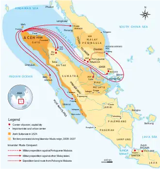 Les succès d'Iskandar Muda reposaient sur la puissance militaire d'Aceh. Le sultanat possédait une infanterie composée de conscrits[3], une cavalerie équipée de chevaux persans, un corps monté sur éléphants, plus de 2 000 canons[4] et une marine dont les bateaux pouvaient embarquer 600 à 800 hommes chacun.
