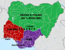 Le pays compte trois grandes ethnies. Les Haoussas vivent surtout dans le Nord du pays et sont musulmans pour la grande majorité. Les Yorubas dominent le Sud du pays, étant chrétiens pour la moitié d'entre eux et musulmans pour le quart d'entre eux. Enfin, les Igbos sont présents dans le Sud-Est, majoritairement chrétiens[5].