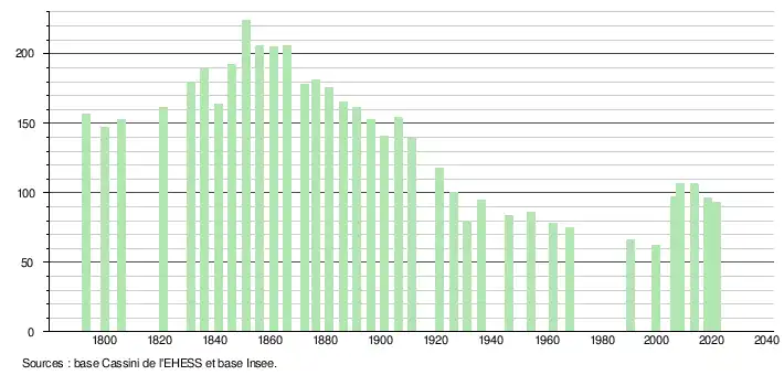 L'évolution du nombre d'habitants est connue à travers les recensements de la population effectués dans la commune depuis 1793. Pour les communes de moins de 10 000 habitants, une enquête de recensement portant sur toute la population est réalisée tous les cinq ans, les populations légales des années intermédiaires étant quant à elles estimées par interpolation ou extrapolation[21]. Pour la commune, le premier recensement exhaustif entrant dans le cadre du nouveau dispositif a été réalisé en 2008[22].
